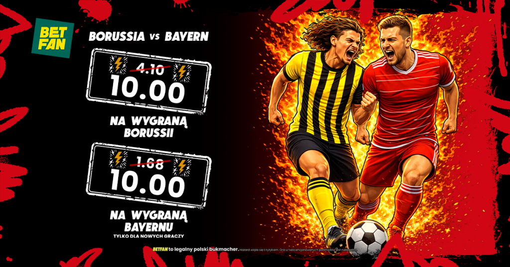 Sobota stoi pod znakiem jednego meczu: Der Klassiker w Dortmundzie! Który zespół wygra to spotkanie? Nowi gracze Betfan mogą zagrać zakład na zwycięzcę tego starcia po kursie 10.00.