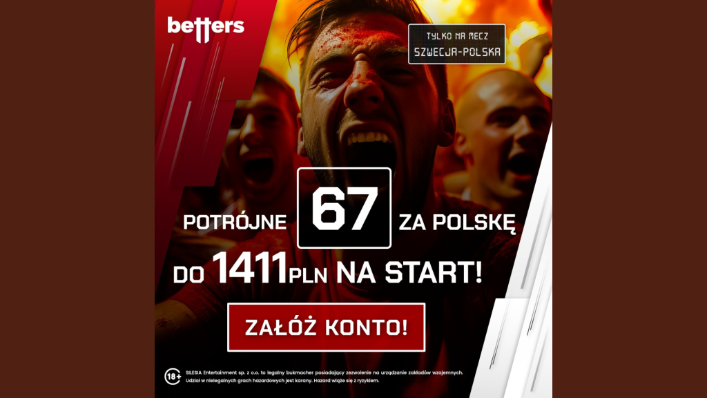 Wyjątkowa promocja Betters na wyjątkowy mecz! Rewanż za Potop! Tylko jeden mecz, a tak wiele podtekstów! Już we wtorek o 20:45 polscy piłkarze zagrają ze Szwedami w decydującym starciu o awans do Mistrzostw Świata 2026. Odbierz specjalną promocję z okazji najważniejszego meczu Polski od wielu miesięcy. Tylko przez te 5 dni możesz zgarnąć dodatkowe 201 PLN we freebetach na start oraz standardowy pakiet powitalny do 1210 PLN!