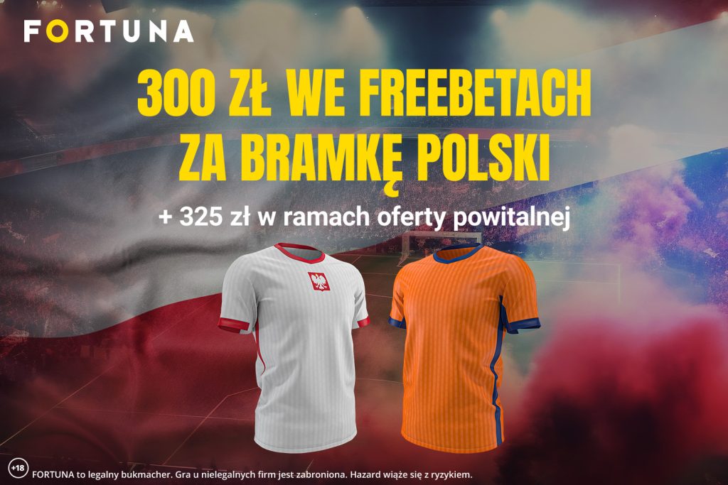 W starciu z Holandią „Biało-czerwoni” powalczą o wyrównanie dorobku punktowego z liderem grupy G i otwarcie sobie drogi do bezpośredniego awansu na mundial. Tym razem nowi gracze bukmachera Fortuna mają podwójny powód, by włączyć się w emocje: postaw kupon na co najmniej 1 gola Polski, a jeśli trafi do siatki – zgarniesz 300 złotych we freebetach!
