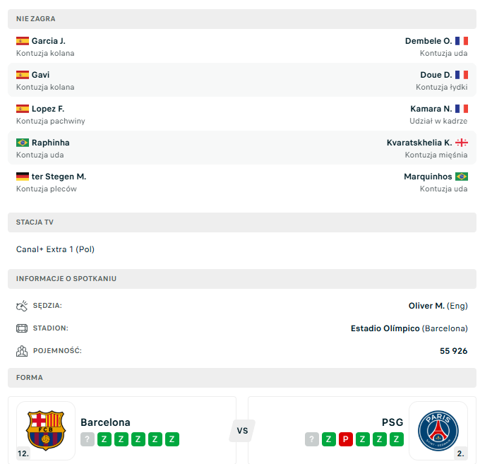 Przede wszystkim: PSG ma przed tym meczem spore problemy kadrowe. Z gry wypada bowiem wyjściowe trio napastników, czyli Dembele, Doue i Kvaratskhelia, a w tyłach zabraknie też kapitana i ostoi defensywy w osobie Marquinhosa. Czy Luis Enrique ma kim załatać te dziury? Teoretycznie tak, ale w rzeczywistości będzie to totalne zjechanie z poziomu sportowego, przez co szanse na punkty w Barcelonie maleją. Hansi Flick też musi mierzyć się z brakami, ale nieobecnego Raphinhę z powodzeniem zastępuje świetny ostatnio Rashford, a Wojciech Szczęsny w bramce to nadal wysoka jakość. Fermin Lopez i Gavi to też dobrzy piłkarze, ale nie postaci nie do zastąpienia, tak jak wspomniana grupa kontuzjowanych w PSG. Obrońca trofeum nie za bardzo ma kim postraszyć, a do tego gra na wyjeździe, więc skoro tej rywalizacji remisy praktycznie się nie zdarzają – lepiej stawiać na Barcę.