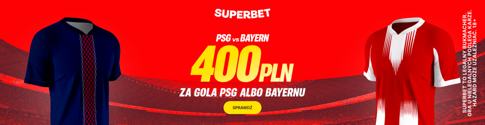 - Gol wybranego zespołu w meczu PSG – Bayern Monachium = bonus 400 złotych,