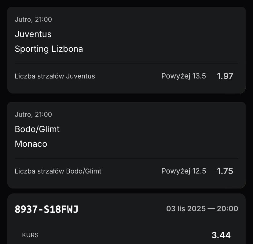 Po serii 5 remisów i następnie 3 porażek Juventus zwolnił trenera i efekt przyszedł od razu. Najpierw zwycięstwo z Udinese, a potem (już ze Spalettim na ławce) pokonanie beniaminka z Cremonese. Oznacza to, że Juve chyba wraca na dobre tory, a grając u siebie w Lidze Mistrzów na pewno będzie miało ochotę na wygraną. Jak wygląda to w kwestii strzałów? W Serie A linia 13,5 pokryta w 6 z 10 meczów, do tego 3 spotkania w przedziale 12-13, ostatnie 4 spotkania zaliczone. Na swoim terenie 25, 24, 25 oraz po 12 z Milanem i Interem, więc mocnymi ekipami. W Lidze Mistrzów u siebie 19 uderzeń z Borussią Dortmund oraz dwukrotnie 13 na wyjazdach z Villarrealem i Realem Madryt, a więc naprawdę trudnymi przeciwnikami. W skrócie: Juventus potrafi postrzelać, w trudnych spotkaniach zbliża się do tej linii, a Sporting potęgą przecież nie jest. Portugalczycy do tej pory nie dawali sobie wbijać aż tyle, ale grają z o wiele słabszymi rywalami niż Juventus, który na pewno ruszy do ataku.