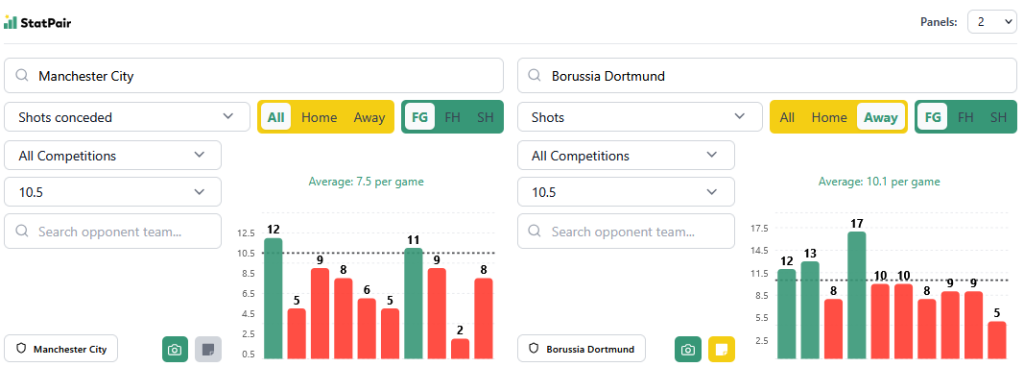 Dla Borussi Dortmund wygląda to kiepsko. BVB potrafi grać z rozmachem i strzelać bardzo chętnie, ale… praktycznie tylko u siebie. Na wyjazdach jest to zupełnie inny zespół, który w tym sezonie w roli gościa grał 9 razy i nie błyszczał. 11 strzałów lub więcej oddał tylko w Pucharze Niemiec z Rot-Weiss Essen oraz słabiutkim Heidenheim na początku sezonu, pozostałe spotkania to przeważnie przedział 8-10. Z zespołami dużo słabszymi od City Borussia miała duże problemy, dlatego w Manchesterze nie wróżymy jej wielkiego wyniku strzeleckiego.