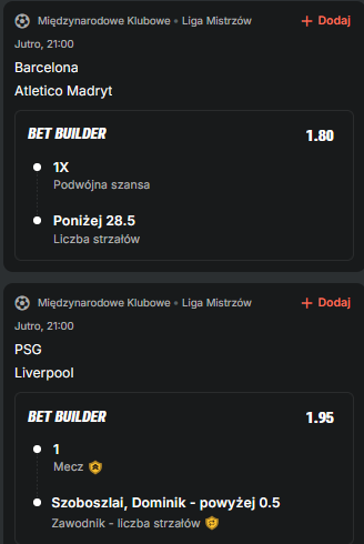 W drugim meczu PSG podejmuje mocno dołujący Liverpool. Forma „The Reds” aktualnie leży i kwiczy, więc trudno typować inny wynik niż zwycięstwo gospodarzy. W poprzedniej fazie paryżanie wygrali u siebie z Chelsea aż 5:2 i choć aż takiego pogromu nie oczekujemy to jednak typujemy, że w rewanżu to Liverpool będzie musiał gonić. Na pewno postara się on o dobry rezultat i spróbuje zaatakować, więc dorzucamy do tego przynajmniej jeden strzał Dominika Szoboszlaia.