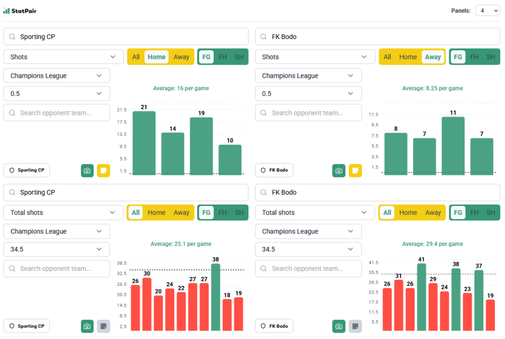 Linia na strzały jest bardzo wysoka, ponieważ legalni bukmacherzy przewidują prawdziwy szturm w wykonaniu Sportingu. Naszym zdaniem koło 30 może się zakręcić, ale aż tyle uderzeń raczej nie będzie. Domyślamy się, że Bodo/Glimt nie będzie miało tu wielkiego udziału w wyniku i zbyt dużo strzałów nie odda skupiając się raczej na szczelnej obronie. Ten zespół i tak na wyjazdach nie strzelał zbyt dużo (12, 8, 7, 11, 7), a tutaj nic z przodu nie musi. Okej, rywale w takich wypadkach notowali solidne liczby (26, 23, 22, 27, 30), a overy meczowe z Atletico i Interem to głównie efekt ogromnej siły przeciwnika. Sporting aż taką potęgą nie jest i tutaj poziom powinien być bardziej wyrównany. Portugalczycy w całej edycji Ligi Mistrzów tylko raz przekroczyli barierę 34 strzałów – 38 w meczu z PSG, gdzie faworyt sam oddał ich aż 28. Sami najwięcej oddali ich 21 ze słabiutkim Kairatem, natomiast w krajowej lidze w ostatnich kolejkach doszli maksymalnie do 23. Spodziewamy się tu dużej przewagi Sportingu licząc, że Norwegowie sami od siebie nie dorzucą zbyt wiele.