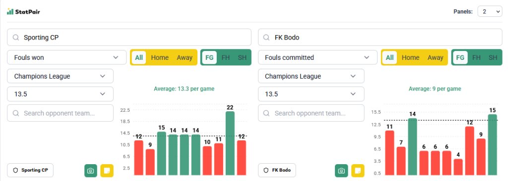 Skoro Sporting ma mieć przewagę to Bodo/Glimt może się cofnąć, a będąc blisko swojej bramki raczej nie będzie chciało faulować, żeby nie prowokować niebezpiecznych stałych fragmentów. Goście w tej edycji tylko dwukrotnie wyszli poza 13 fauli, w domowych meczach z Monaco i Sportingiem, a na wyjazdach przepisy łamali 11, 7, 6, 4 i 9 razy. Sporting jest co prawda jedną z częściej faulowanych ekip, ale tutaj liczę na głębiej ustawionego rywala, który nie będzie chciał ryzykować w okolicy swojego pola karnego.