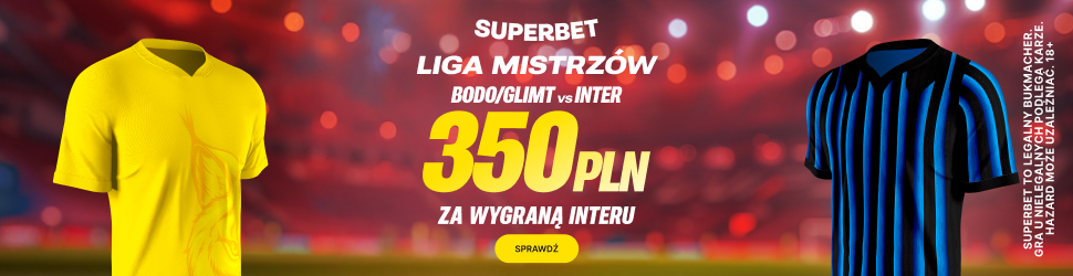 Faza Play-Off to również kolejna świetna promocja bukmachera Superbet: aż 350 złotych dodatkowego bonusu dla nowych graczy! Należy dokonać pełnej rejestracji z kodem PEWNIACZKI, wpłacić 50 złotych i wygrać zakład na zwycięstwo Interu z Bodo/Glimt lub brak porażki Atletico z Club Brugge.