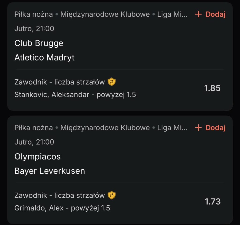 Atletico na wyjazdach traci trochę na jakości i w Lidze Mistrzów notuje gorsze wyniki niż u siebie (choć przegrywała z bardzo trudnymi przeciwnikami), natomiast Club Brugge u siebie potrafił wbić 3 gole Marsylii czy Barcelonie. Wydaje nam się, że dla gospodarzy to być może jedyna okazja, żeby zrobić dobry wynik przed rewanżem w Madrycie, a do stracenia nie mają w sumie nic. No i tutaj płynnie przechodzimy do postaci Stankovicia, który liczbowo prezentują się naprawdę przyjemnie. Aktualnie pracuje on w trybie „strzelaj, nie zastanawiaj się”, bo od 6 meczów notuje minimum 2 strzały, a konkretnie seria ta wynosi 3, 3, 4, 2, 4 i 3. W samej Lidze Mistrzów syn legendarnego Dejana miał wyborną końcówkę, bo w trzech ostatnich kolejkach oddał ich łącznie aż 13 (6 z Arsenalem, 3 z Kairatem i 4 z Marsylią). Najlepiej wyglądało to akurat u siebie, bo na 4 spotkania linii nie pokrył tylko z Barceloną. Jeśli Club Brugge ma powalczyć o korzystny wynik to nie zdziwi nas ofensywny zryw Stankovicia.