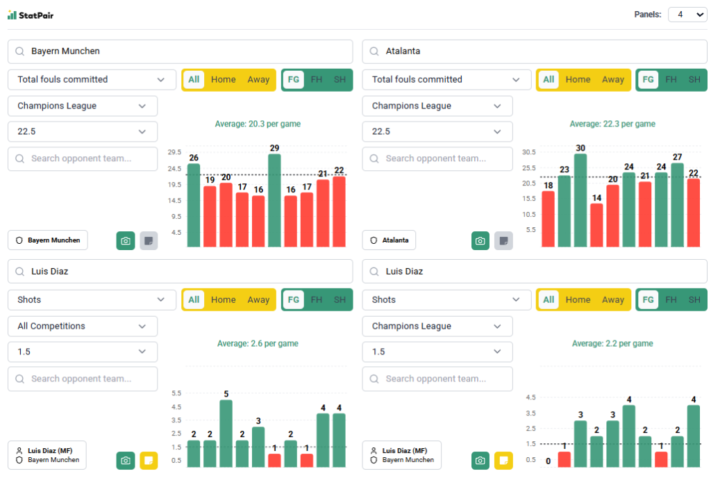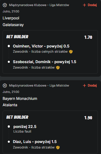 W pierwszym meczu może być całkiem ostro, bo wynik jest na ostrzu noża. W drugim zaś sprawa jest załatwiona, bo Bayern wygrał w Bergamo aż 6:1 i to będzie tylko odhaczenie obowiązku. Z tego powodu nie spodziewamy się zbyt ostrej gry, której i tak w meczach lidera Bundesligi raczej nie widzimy. Celujemy tu w under fauli, który podbijamy zakładem na dowolne dwa strzały Luisa Diaza.