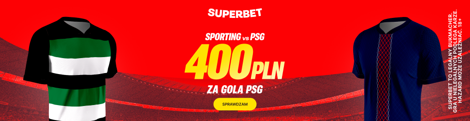 Skoro mowa o hitach to takimi sa też promocje Superbet: aż 400 złotych dodatkowego bonusu dla nowych graczy! Należy dokonać pełnej rejestracji z kodem PEWNIACZKI, wpłacić 50 złotych i wygrać zakład pojedynczy na gola PSG ze Sportingiem lub zwycięstwo Realu Madryt z Monaco.