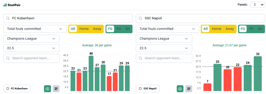 Taką samą linię, ale po jeszcze wyższym kursie mamy w przypadku meczu Kopenhagi z Napoli. Tutaj grają zespoły będące na granicy wypadnięcia z fazy pucharowej i TOP 24, zatem tutaj tym bardziej może być naprawdę ostro. Co do argumentów – zacznijmy od przejrzenia statystyk obu zespołów.