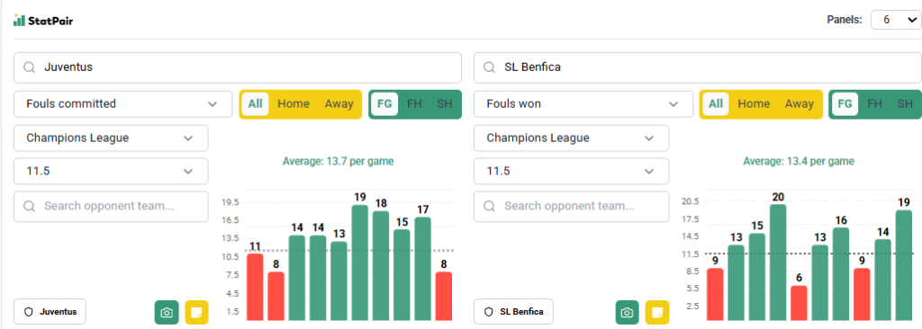 Jak często fauluje Juventus? Biorąc pod uwagę Serie A w ostatnich 10 kolejkach mieliśmy aż 8 spotkań powyżej 12 przewinień, jeden styk i jeden wyraźny under. Jak wygląda to w Lidze Mistrzów? Równie dobrze – zaczęło się od serii 5 spotkań z pokrytą linią (13, 19, 18, 15 i 17) z jednym wyjątkiem w postaci 8 fauli na Pafos (rzadko faulowany zespół). Jak widać, w przypadku Juventusu nie jest problemem przekraczanie tej granicy, bo przeważnie mamy tu spory zapas. Wiele zależy od rywala, ale Benfica…