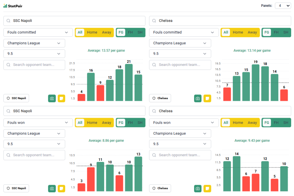 W ostatnich 10 spotkaniach Napoli przeważały overy, było ich 6, dwukrotnie kończyli oni na równej liczbie 9, a w ostatnich 4 starciach zanotowali 11, 11, 10 i 15 przewinień. W samej Lidze Mistrzów jest mocno, bo pod kątem fauli to ścisła czołówka – 5 z 7 spotkań powyżej linii 9,5, w meczu z PSV raz na styku i jeden under, ale było to po czerwonej kartce w 1 połowie z Manchesterm City. Same spotkania domowe: 16, 12 i 18 fauli, więc idealnie. W drugą stronę takiej bomby nie ma, ale tragedii też – 4 z 7 z overem i raz na styku, a poniżej z City w tym wspomnianym meczu oraz z Qarabagiem, który w tej edycji fauluje najrzadziej. Liczymy też na to, że osoba Antonio Conte, jako były menadżer „The Blues”, nastawi swoją ekipę tak, aby ta nie odstawiała nogi.