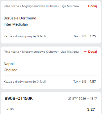 Legalni bukmacherzy jeszcze wyższy kurs wystawili na taki zakład w meczu Napoli z Chelsea. Aktualny mistrz Włoch jest na 25 miejscu i nawet remis może być niewystarczający, natomiast Chelsea bez zwycięstwa zapewne wypadnie z TOP 8 – tutaj po jednej i drugiej stronie potrzeba punktów jest paląca. Skoro tak to uznajemy, że 10 fauli jest jak najbardziej do zrobienia.