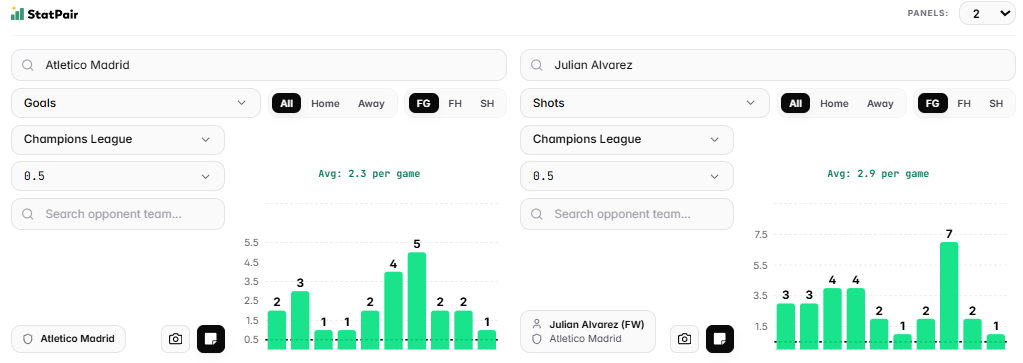 Co do strzałów to idziemy w dublet Juliana Alvareza, nie muszą być to próby celne. Pisze się, że Argentyńczyk może nie zagrać z powodu urazu, przez który nie wystąpił z Elche i Bilbao, ale uważamy to za lekką zasłonę dymną i zaryzykujemy wrzucenie go do tego zakładu. W weekend był już na ławce, a półfinał u siebie to zbyt ważne spotkanie, żeby klub nie doprowadził go do odpowiedniego stanu. 9 goli, średnia 3 strzałów/mecz i tylko dwa spotkania, w których nie pokrył on linii 1,5. W wyjazdowym starciu z Arsenalem oddał ich 3, więc jeśli zagra to u siebie też powinien dać radę.