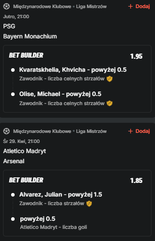 Wydaje nam się, że mocniejsza para półfinałowa to właśnie ta francusko-niemiecka. PSG zagra z Bayernem i tutaj żaden rezultat (poza wyraźnym pogromem którejś ze stron) nie będzie zaskoczeniem, bo spodziewamy się naprawdę wyrównanej rywalizacji. W tym przypadku wykazujemy wiarę w aktywność dwóch skrzydłowych i liczymy na celne strzały Kvichy Kvaratshkelii oraz Michaela Olise.