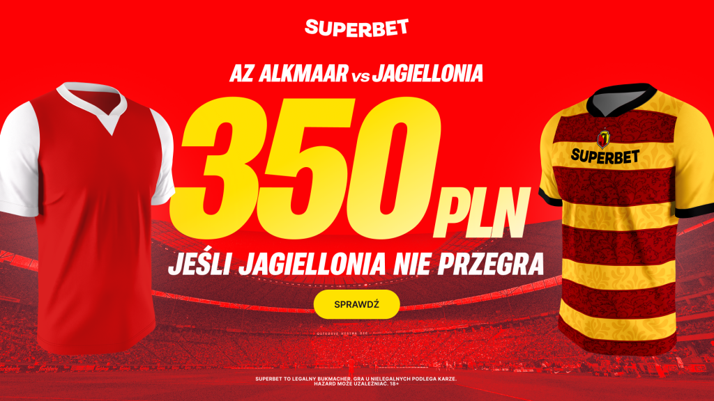 W ostatnim meczu fazy ligowej Ligi Konferencji Jagiellonia Białystok zagra na wyjeździe z holenderskim AZ Alkmaar. Czy „Jaga” wyjedzie z tego spotkania z punktami? Nowi gracze Superbet mogą odebrać dodatkowe 350 złotych, jeśli Jagiellonia nie przegra.