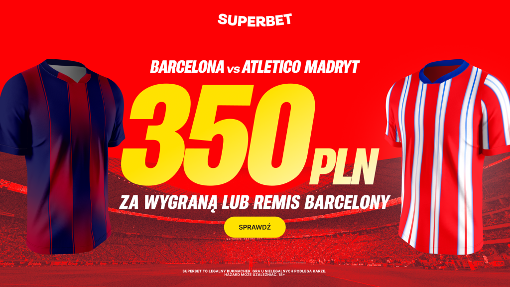 Wtorkowy mecz Barcelony z Atletico Madryt to prawdziwy hit i główny punkt grania w środku tygodnia. Czy lider La Liga poprawi swój dorobek punktowy z tak trudnym rywalem? Nowi gracze Superbet mogą odebrać dodatkowe 350 złotych bonusu, jeśli Barcelona nie przegra tego spotkania.