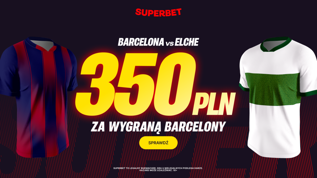 - Za poprawny typ na zwycięstwo Barcelony w meczu z Elche wygrywasz Bonus 350 PLN.