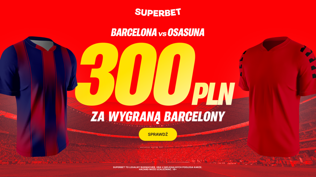 Barcelona jest w świetnej formie, a w sobotę podejmie Osasunę, z którą wygrywa niemal każde domowe spotkanie od lat. Czy zrobi to również w tym sezonie? Nowi gracze Superbet mogą odebrać dodatkowe 300 złotych bonusu za wygrany zakład na zwycięstwo Barcelony.