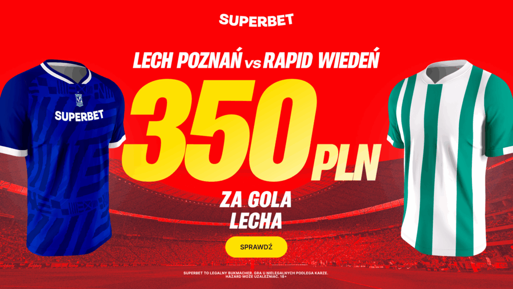 Czas zacząć fazę ligową Ligi Konferencji! Z tej okazji nowi gracze Superbet mogą odebrać dodatkowy bonus w wysokości 350 PLN – wystarczy wygrać pierwszy zakład singiel na gola Lecha Poznań w meczu z Rapidem Wiedeń.