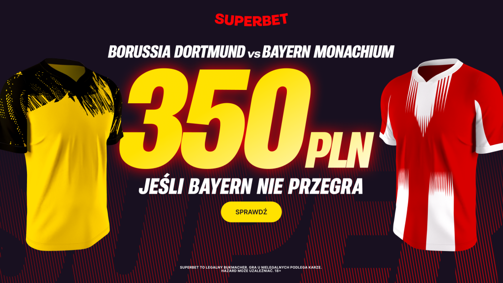 Der Klasikker to jeden z największych hitów tego weekendu. Czy Bayernowi uda się wyjechać z Dortmundu z przynajmniej 1 punktem? Nowi gracze Superbet korzystający z kodu PEWNIACZKI odbiorą 350 złotych bonusu za wygranie takiego zakładu.