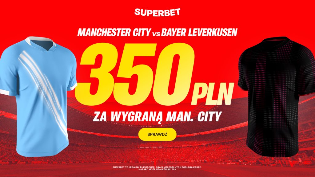 Manchester City w meczu z Bayerem Leverkusen będzie wyraźnym faworytem. Czy klub z Anglii pokona rywala i dopisze sobie kolejne 3 punkty? Nowi gracze Superbet mogą odebrać dodatkowe 350 złotych za wygrany zakład na zwycięstwo Manchesteru City w tym spotkaniu.