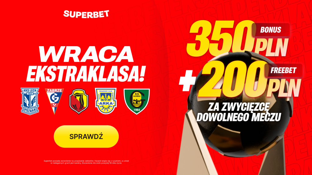 Wraca Ekstraklasa, przed nami pierwsze mecze ligowe w 2026 roku! Z tej okazji bukmacher Superbet przygotował promocję, w ramach której nowi gracze korzystający z kodu PEWNIACZKI mogą odebrać dodatkowe 350 złotych za wygranie zakładu na zwycięzcę dowolnego spotkania.
