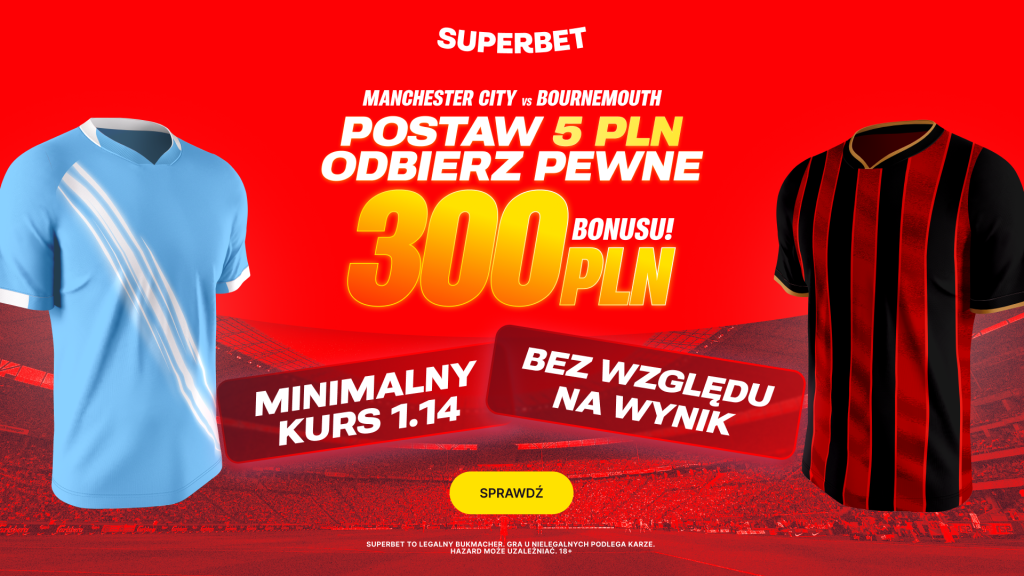 W niedzielne popołudnie Manchester City podejmie rewelacyjnego wicelidera z Bournemouth. Spotkanie to będzie o tyle ciekawe, że nowi gracze mogą przy tej okazji odebrać PEWNE 300 PLN bonusu. Wystarczy postawić dowolny zakład na to starcie.