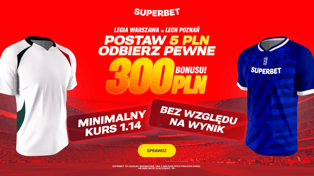 Nie tylko hiszpańskie El Clasico – w Polsce też mamy prawdziwy hit między wielkimi klubami. W niedzielę mecz Legii z Lechem, za który nowi gracze mogę odebrać PEWNE 300 PLN bonusu. Wystarczy postawić dowolny zakład na to spotkanie.