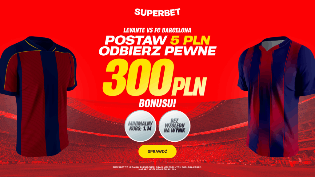 Nowy sezon to również nowy rodzaj promocji w Superbet! W ten weekend nowi gracze zakładający konto z kodem PEWNIACZKI mogą skorzystać z ciekawej akcji – dowolne zdarzenie na mecz Levante – Barcelona zagrane za 5 PLN oznacza pewny bonus 300 PLN!