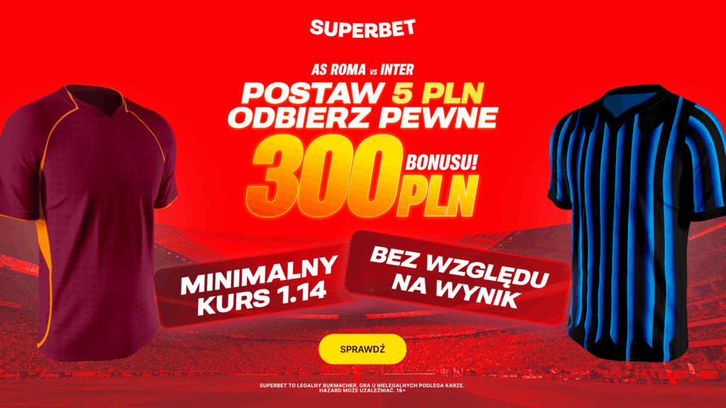 - Zagraj pierwszy kupon singiel za dokładnie 5 PLN (nie mniej, nie więcej) na dowolny zakład z oferty przedmeczowej w meczu AS Roma – Inter Mediolan z kursem min. 1.14.