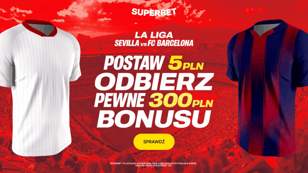 Nowy rodzaj promocji w Superbet na niedzielę w La Liga! W ten weekend nowi gracze zakładający konto z kodem PEWNIACZKI mogą skorzystać z ciekawej akcji – dowolne zdarzenie na mecz Sevilla – FC Barcelona zagrane za 5 PLN oznacza pewny bonus 300 PLN!