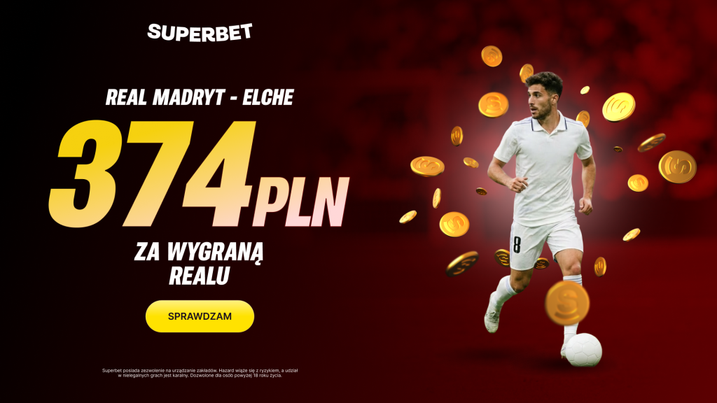 - Za poprawny typ na zwycięstwo Realu Madryt w meczu z Elche wygrywasz Bonus 374 PLN.