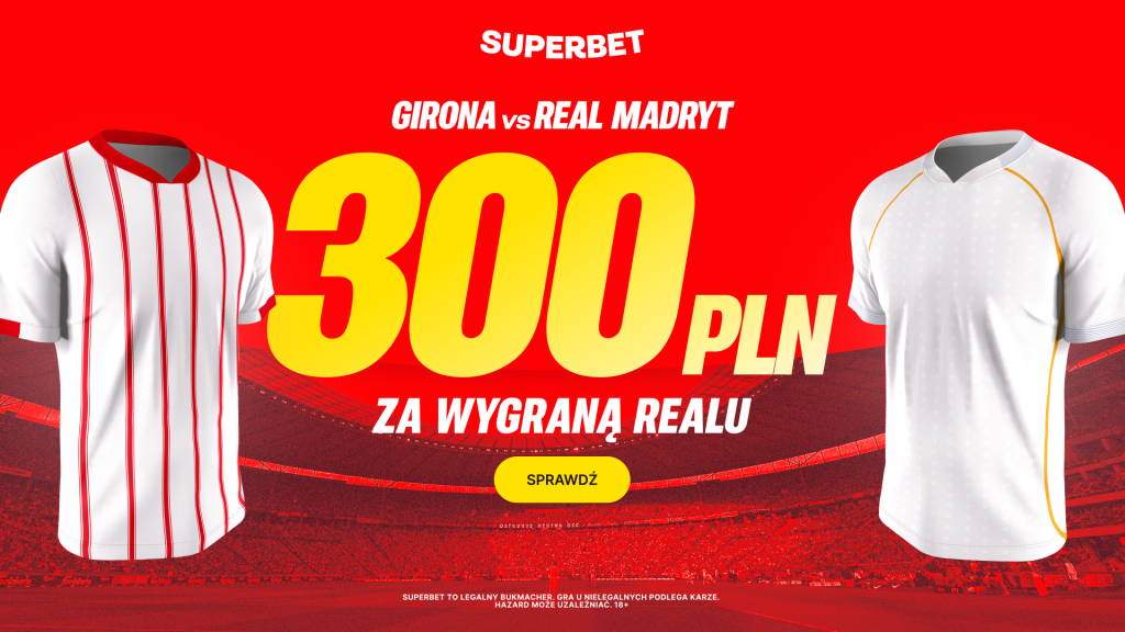 Real Madryt w niedzielę zagra ligowe spotkanie z Gironą i będzie w nim murowanym faworytem. Czy zgarnie 3 punkty? Nowi gracze Superbet mogą odebrać dodatkowe 300 złotych bonusu, jeśli wygrają zakład na zwycięstwo Realu.