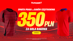 W czwartkowy wieczór Raków Częstochowa zagra w Lidze Konferencji z czeską Spartą Praga. Czy zdoła wywieźć stamtąd korzystny wynik? Nowi gracze Superbet rejestrujący się z kodem PEWNIACZKI mogą odebrać dodatkowe 350 złotych bonusu, jeśli Raków strzeli w tym spotkaniu przynajmniej jednego gola.