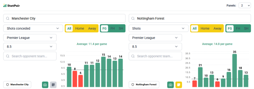 Linia 8,5 nie jest zbyt wymagająca, choć wiadomo – City to City, zespół z najwyższej półki. Sęk w tym, że w meczach z nimi większości rywali udaje się jej pokrycie, bo robiło to 8 z 10 poprzednich przeciwników w Premier League. Na tym terenie 11 strzałów oddał ostatni w tabeli Wolverhampton, a ostatnio 14 uderzeń na swoim terenie zaliczyło Leeds, także walczący o życie Forest także mogą powalczyć. Oni ostatnio są nastawieni dość bojowo, bo we wszystkich rozgrywkach 9 razy z rzędu strzelali 9 razy lub więcej, a niedawno potrafili zaliczyć aż 18 prób z Liverpoolem. W 10 kolejkach Premier League mieliśmy zaś tylko 2 undery – z Arsenalem i… właśnie Manchesterem City. Liczymy, że lekcja została wyciągnięta i Forest poradzą sobie lepiej niż w grudniu zwłaszcza, że cały czas maja nóz na gardle.