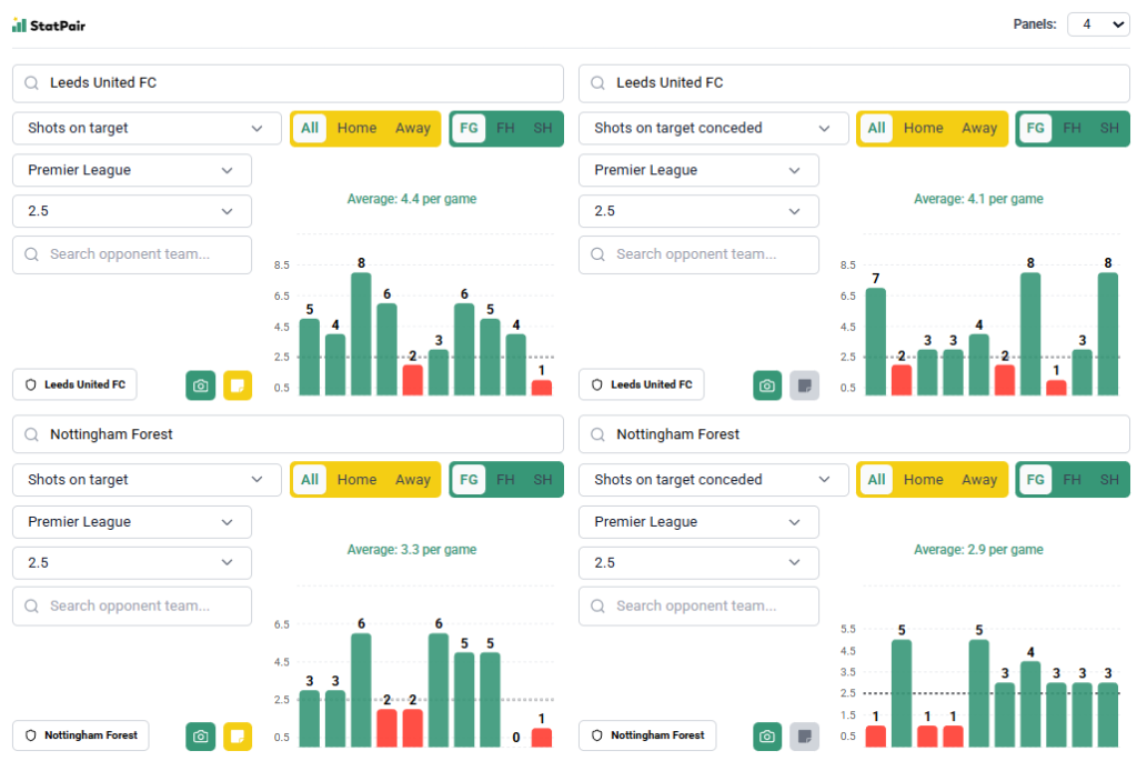 Jak w tej kwestii wyglądają gospodarze? Oni dali się poznać jako zespół potrafiący oddawać naprawdę sporo strzałów (zwłaszcza u siebie), więc tutaj przynajmniej trzy trafione w światło bramki to raczej zadanie do wykonania. Na 10 poprzednich meczów ligowych „Pawie” pokrywały linię 2,5 w 8 przypadkach (poza starciami z Liverpoolem i Arsenalem), natomiast ich przeciwnikom ta sztuka udawała się siedmiokrotnie. Ciekawie sprawa wygląda w przypadku Forest, bo tutaj lepsze wyniki mamy właśnie na wyjazdach. 9 z 10 spotkań we wszystkich rozgrywkach, a także 3, 3, 2, 5 i 5 celniaków w ligowych wycieczkach to liczby, które napawają nas optymizmem i każą wierzyć, że goście powalczą. Ich przeciwnicy nie mają z tym żadnych problemów, więc spodziewamy się, że ofensywnie nastawione Leeds też da sobie radę. W pierwszym meczu w tej statystyce było 6-3 dla ówczesnego gospodarza i powtórka nas nie zmartwi.