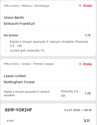 W Bundeslidze zagrają ze sobą dwa zespoły, które rozpaczliwie szukają przełamania – Union nie wygrał żadnego z 5 meczów w 2026 roku, natomiast seria Eintrachtu jest jeszcze dłuższa i wynosi aż 8 spotkań. Legalni bukmacherzy faworyzują dziś gospodarzy, natomiast nie uwierzymy, że goście odpuszczą sobie to starcie. Celujemy w połączenie zakładów na min. 3 celne strzały obu drużyn oraz przynajmniej 2 gole na tablicy wyników.