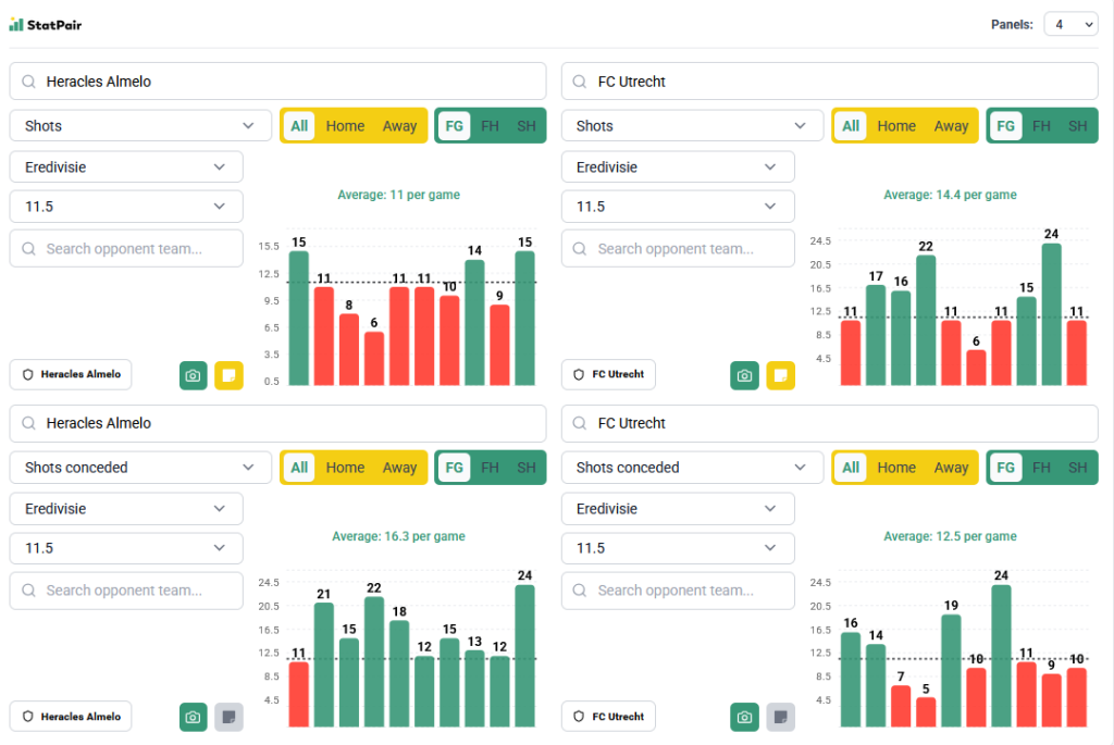 Zacznijmy od strzałów., bo tutaj mamy kilka przesłanek mówiących nam, że Utrecht powinien oddać ich więcej. W tym sezonie Heracles należy do najrzadziej uderzających zespołów Eredivisie – jego średnia meczowa to 11,2, a więc 16 wynik w lidze (na 18 klubów). W tej tabeli Utrecht jest znacznie wyżej (14,7, 9. miejsce), a przy tym w ostatnich tygodniach też notuje wyraźnie lepsze liczby. W poprzednich 10 kolejkach gospodarze 3-krotnie przebili 11 strzałów (plus dwa mecze z dokładnie taką liczbą), sami dopuścili do min. 15 uderzeń w 6 spotkaniach, a łącznie w ośmiu przypadkach oddali mniej strzałów niż przeciwnik. W przypadku Utrechtu mamy tylko jeden mecz poniżej 11 prób (4 razy na styku i 5 raz z min. 15) i 6 spotkań, gdzie uderzali częściej. Nie udawało się to przeważnie w meczach z innymi overowymi zespołami, a więc NEC, Heerenveen i Feyenoordem, a także Bredą. Jeśli chodzi o bilans H2H to mamy tu serię pięciu meczów, w których przewagę miał Utrecht, a Heracles nie wyszedł poza „dychę”.
