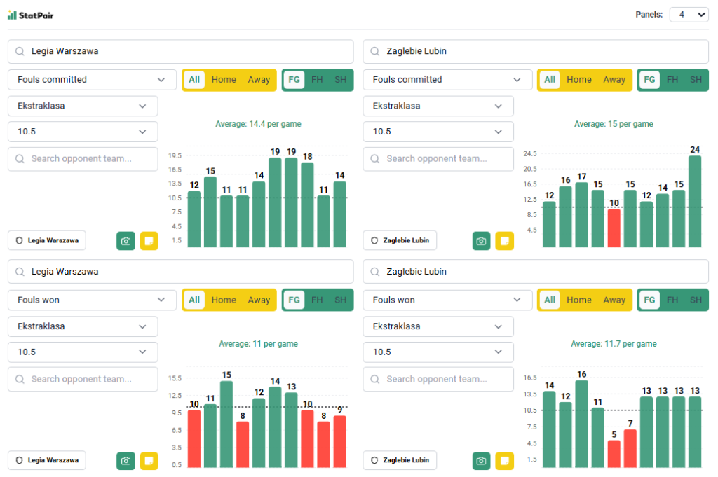 Przede wszystkim: Legia i Zagłębie to pierwsza i czwarta najczęściej faulująca drużyna tego sezonu Ekstraklasy. Patrząc na ostatnie mecze jednych i drugich można szybko potwierdzić, że linia 10,5 nie powinna być dla nich problemem – w 10 poprzednich kolejkach zespół z Warszawy pokrył ją za każdym razem, natomiast „Miedziowi” nie zrobili tego tylko raz (10 z Wisłą Płock). Jeśli chodzi o generowanie przewinień u przeciwników to w Legii jest nieco gorzej – w jej przypadku mamy 5/10 meczów z 11 faulami rywala (+3 spotkania na styku), natomiast Zagłębie wymusiło taką liczbę aż 8-krotnie (aktualnie seria 4 spotkań z 13 faulami). Jesienią w Lubinie w tej statystyce było 17-13 dla wicelidera Ekstraklasy i coś nam mówi, że w piątek może być podobnie.