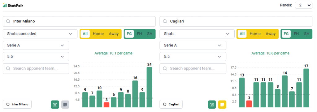 Linia 5,5 w obu przypadkach, niezależnie od okoliczności, wygląda na lekkie niedoszacowanie. Rywale Interu pokrywali ją bowiem w aż 9/10 poprzednich kolejek i tyle samo razy udawało się to po stronie Cagliari. Poprzednie starcia szału nie robiły, co goście dobijali do 5, 8 i 6 uderzeń, ale i tak dwukrotnie dali radę, a w tych okolicznościach jak najbardziej powinni być na plus. Jeszcze wyższy kurs widnieje przy zakładzie na +2,5 strzałów gości w pierwszej połowie, ale tutaj już mocno się ograniczamy.