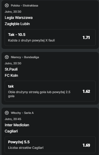 W Ekstraklasie wybieramy drugi, wieczorny mecz, w którym dryfująca na granicy strefy spadkowej Legia podejmie walczące o tytuł Zagłębie. Role tych zespołów przez lata były zupełnie odwrotne, natomiast ten sezon jest bardzo szalony i wywrócił wiele spraw do góry nogami. Uważamy, że te zespoły mogą dać nam dość agresywne spotkanie i popełnia po 11 fauli lub więcej.