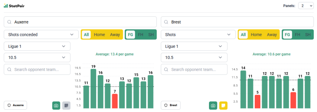 Teoretycznie to Auxerre powinno być zespołem bardziej zainteresowanym wygraną, ale jednak dobra forma gości sprawia, że szukamy tu szczęścia w zakładzie po ich stronie. Brest w ostatnich 10 kolejkach nie szalał i głównie kręcił się wokół 11-12 strzałów, ale był w tym bardzo regularny i poniżej linii 10,5 zszedł tylko dwukrotnie. Warto przy tym dodać, że jeden z tych underów to spotkanie z Metz, gdzie ponad godzinę trzeba było grać w osłabieniu, co wpłynęło na taki przebieg gry. Druga sprawa to defensywa Auxerre, które dopuszcza swoich przeciwników do strzałów w miarę często. W ostatnich 10 kolejkach tylko Paris FC nie dobił do 11 uderzeń, a jednym z zespołów kończących na plus był właśnie Brest, który zatrzymał się na dokładnie 11 próbach.