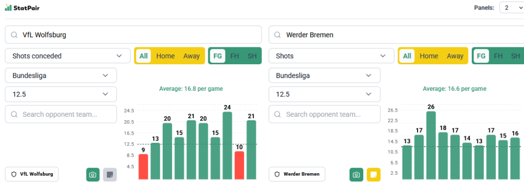 Po pierwsze: Wolfsburg pozwala swoim rywalom na bardzo dużo. Kamil Grabara jest bardzo zapracowanym człowiekiem, bo jego przeciwnicy oddają mnóstwo strzałów – z 10 ostatnich rywali linii 12,5 nie pokrył tylko duet z Hamburga (HSV i St. Pauli), natomiast każdy pozostały nie miał z tym najmniejszych problemów. „Wilki” są w fatalnej dyspozycji (choć rywal jest niewiele lepszy) jeśli są do ugryzienia to Werder raczej na pewno skorzysta.