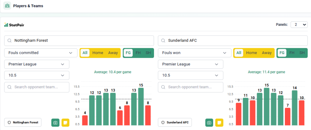 Druga sprawa to generowanie fauli przez Sunderland. Ten zespół jest w tym całkiem dobry, bo na 10 ostatnich przeciwników w Premier League powyżej linii 10,5 kończyło sześciu, natomiast Liverpool i Aston Villa kończyły na równych 10. Ostatnie trzy drużyny przyjeżdżające na ten stadion pokrywały linię, a sędzia Darren England również potrafi używać gwizdka w taki sposób, aby pomóc nam zazielenić ten zakład.