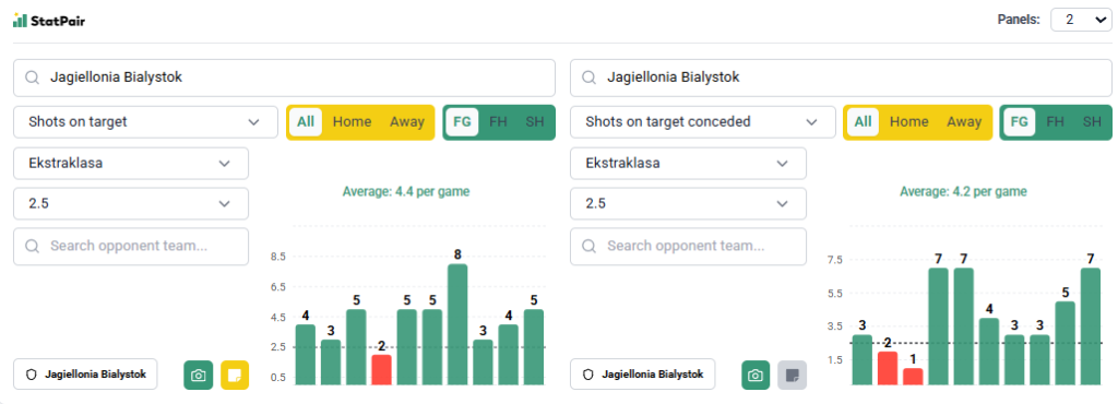 Pod kątem liczb Jagiellonia wygląda tu naprawdę dobrze. W całym sezonie wykręciła ona jak na razie meczową średnią 5,2 celnych strzałów (3 miejsce), a w ostatnich 10 kolejkach linii 2,5 nie pokryła zaledwie raz (na wyjeździe z Lechią). Niewiele gorzej radzą sobie jej przeciwnicy – w tym okresie do trzech celnych uderzeń nie dobili tylko dwukrotnie (Radomiak i Legia, oba mecze u siebie), a w ostatnich 7 kolejkach robił to każdy.
