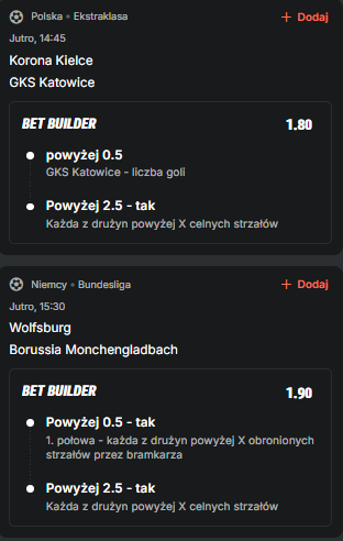 W Bundeslidze wybieramy mecz Wolfsburga z Gladbach, bo tutaj może dziać się naprawdę sporo. Gospodarze walczą jeszcze chociaż o baraże, przed którymi uciekają z kolei goście. Uznajemy, że w tej parze zobaczymy po 3 celne strzały z jednej i drugiej strony, a przy tym obaj bramkarze zaliczą po interwencji już w pierwszej połowie.