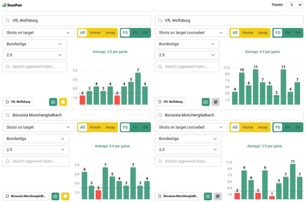 Wolfsburg musi zaatakować, innego wyjścia nie ma. Z drugiej strony jego gra w obronie woła o pomstę do nieba, co stwarza na starcie dużą szansę dla rywala, dlatego spodziewamy się uderzeń w obu kierunkach. „Wilki” linię 2,5 celnych strzałów pokrywały w 8/10 ostatnich kolejek ligowych oraz 4 poprzednich meczów domowych, natomiast ich przeciwnicy mieli tu 100% skuteczności, co przy tak dużej liczby przyjmowanych uderzeń dziwić nie może. Goście z kolei tylko raz nie spełnili tego warunku po swojej stronie, natomiast ich przeciwnicy problemy napotkali 3-krotnie. Warto jednak zaznaczyć, że były to mecze domowe, natomiast w delegacji Gladbach pozwalało na oddanie 9, 6, 9, 5 i 11 celnych uderzeń.