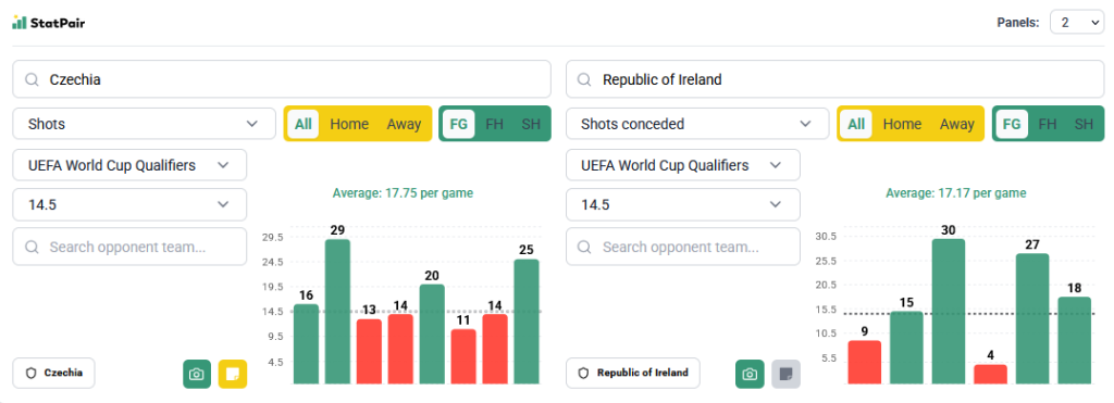 Rywal będzie sprzyjał takiemu graniu, bo Irlandia pozwala swoim oponentom na dość sporo, zwłaszcza na ich terenie. O ile w eliminacyjnych meczach domowych z overem wróciła tylko Portugalia, tak na wyjazdach było już ciekawiej. Najlepszy zespół w grupie strzelał 30 razy, Węgry zrobiły to 18 razy, a Armenia (wyraźnie słabsza niż Czechy) 15 razy. Wcześniej w Lidze Narodów było podobnie, bo słabsze zespoły Finlandii i Bułgarii notowały tylko 7 uderzeń, ale znacznie mocniejsi Grecy i Anglicy przebijali już 20 (21 i 22).